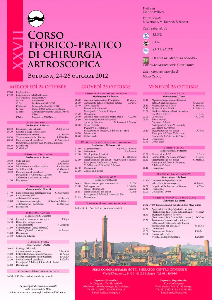 Giunto alla sua ventisettesima edizione, il corso ha come finalità l’aggiornamento dei Medici Ortopedici circa il confronto fra le varie procedure del trattamento delle patologie articolari con tecniche artroscopiche.